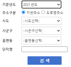 클릭을 하면 기준연도, 주소 구분, 시도, 시군구, 읍면동, 단지명 을 검색할 수가 있는데요.