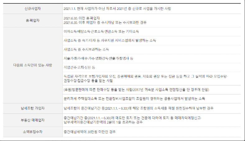 그렇지만 제외되는 사람도 있는데요. 아래에 해당하는 사람은 중간예납 납부대상에서 제외됩니다.