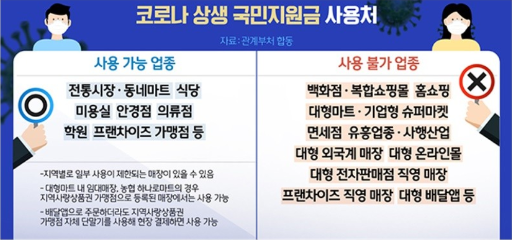 국민지원금 사용처 대표적으로 사용할 수 있는 곳은 전통시장, 동네 슈퍼마켓, 식당, 미용실, 안경점, 학원, 병원, 프랜차이즈